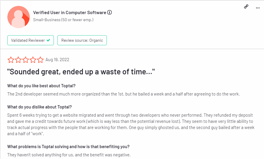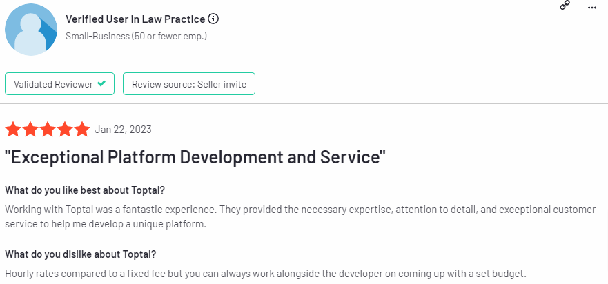 Toptal has 4.7 stars on G2. Among the client reviews we found, it appears most of them are positive. One client however was pretty much unhappy about the quality of service they got.