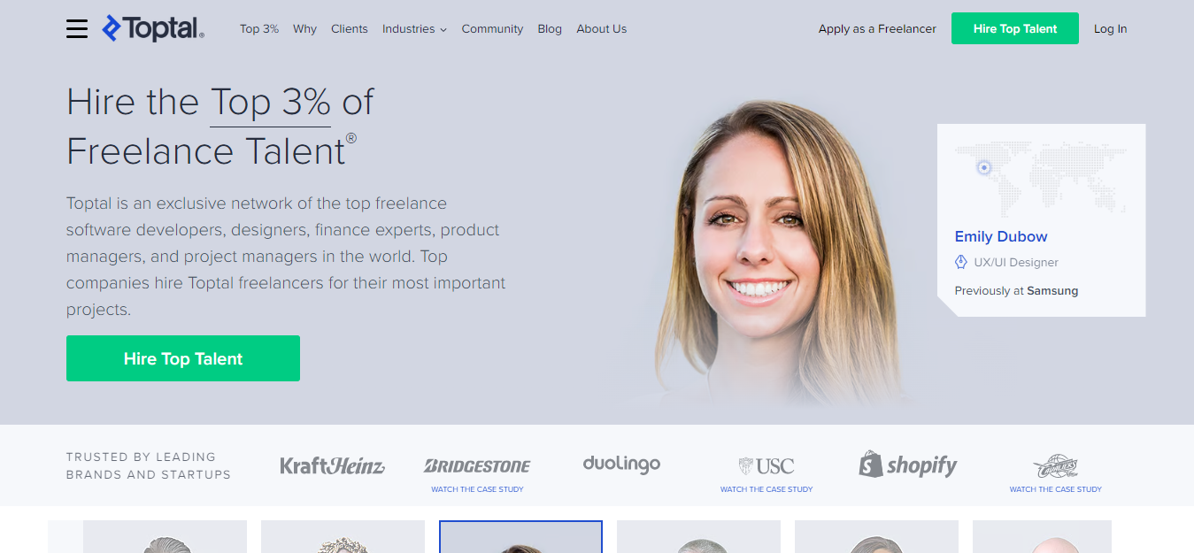 Toptal is a freelance platform that connects businesses with top freelance developers, designers, and project managers from around the world. They claim to work with the top 3% of the world’s best talent. That’s why they’re notorious for their vigorous vetting process.