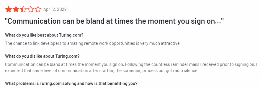 Turing.com has a decent 4.1 out of 5 rating on G2, though it appears most of the reviews are by developers, so it’s difficult to spot real client reviews.