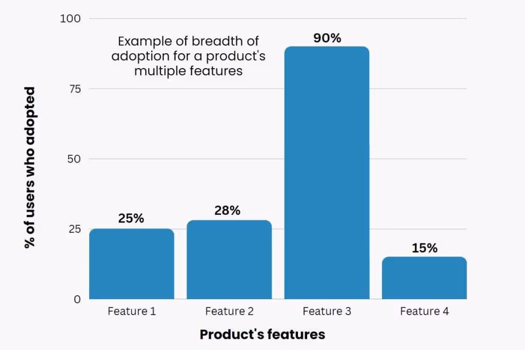 A higher breadth indicates that a feature attracts more users. For example, In the graph above we can see Feature 3 was the feature adopted by most users, meaning it’s highly valuable.