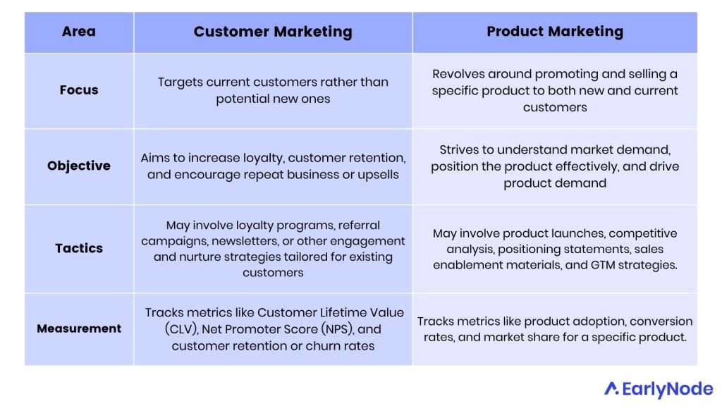 There’s only a slight difference between customer marketing and product marketing since, technically, the former falls under the latter. Let’s look at the details: