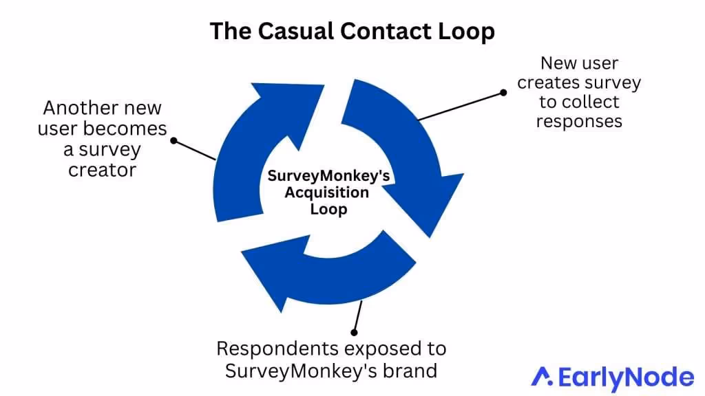 Elena calls this the “casual contact” loop. It works like this: a user distributes content using your product and another person becomes aware of your brand by interacting with that content. A typical example is the “Powered by [brand]” symbols you find on some websites.