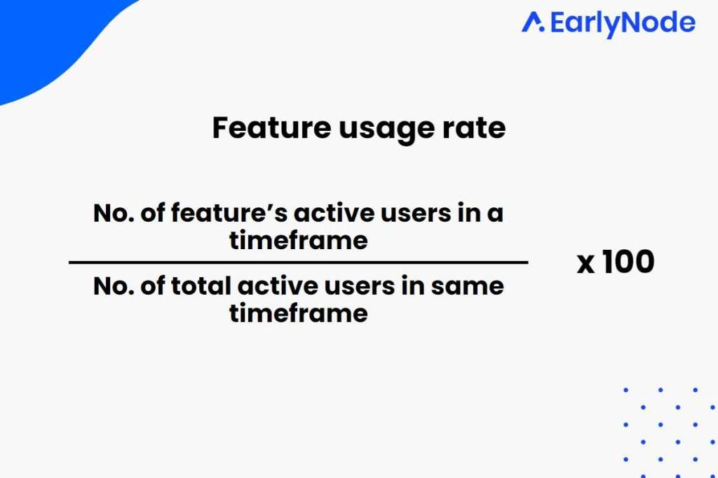 To determine a feature’s usage rate, count the number of active users, divide it by the total number of active users within that timeframe, and multiply by 100.