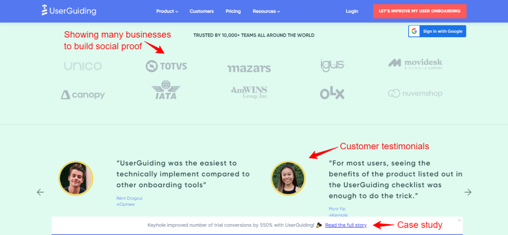 You can also highlight successful case studies to boost your credibility further, just like Userguiding did.