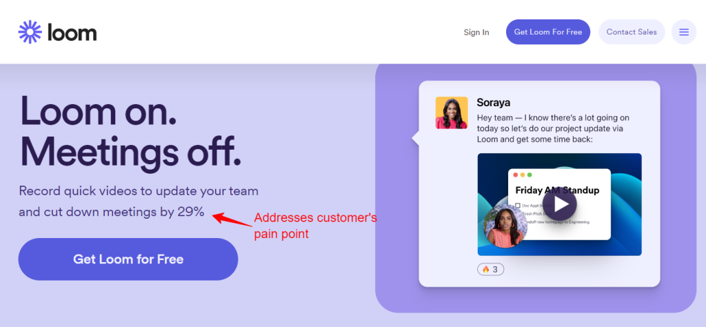 On Loom’s homepage, you can see how their messaging addresses their customer’s pain points by presenting their product as the solution to cutting down the number of meetings.