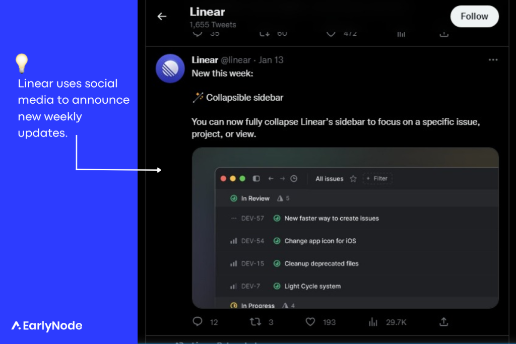 📢 Go multi-channel: Linear makes their release notes distribution easy with their weekly release log tweet. Yes, they tweet out their minor bug fixes and keep users engaged on both their website and social channels.