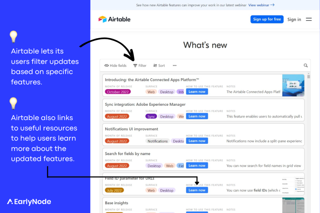 🔎 Make it filterable: Airtable lets its users filter their product updates based on the features and release dates, making it easier for users to read updates relevant to their work.