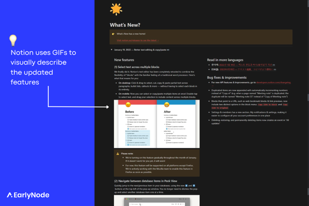 Notion’s another example of a team using their own product to create release notes. Notion also uses images and GIFs in a creative way to illustrate the new features.