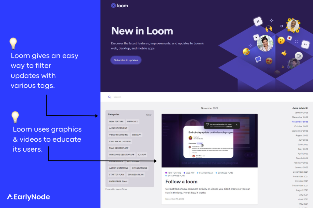 🔎 Make it filterable: Loom allows you to filter updates based on the pricing plan, device, and even the month the update was made so that you can check out stuff from their archive.