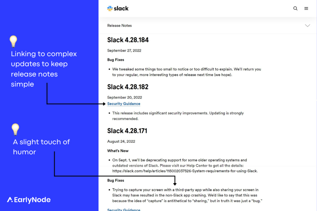 🏷️ Stay on brand: Slack’s brand is cool and easygoing, so it makes sense that their release notes are very conversational. They don’t hesitate to throw in a joke or two to make their users smile.