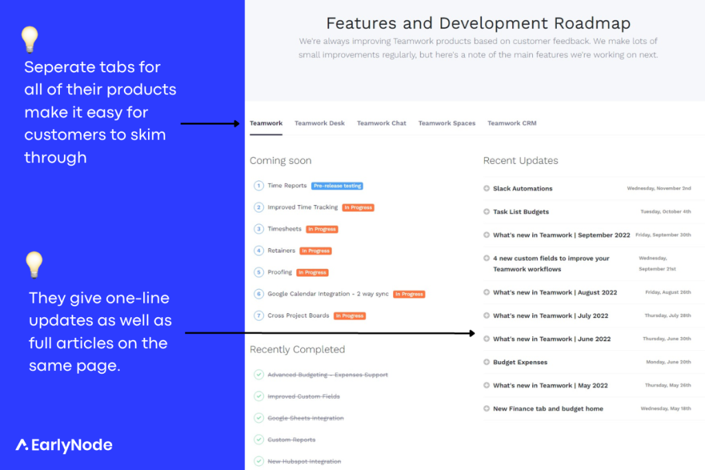 💥 Build hype: Putting recent updates and future product roadmaps on one page is tough to pull off. Users can mistake the roadmap for updates, but TeamWork impresses with how they deliver this page and excite their users about the upcoming releases.