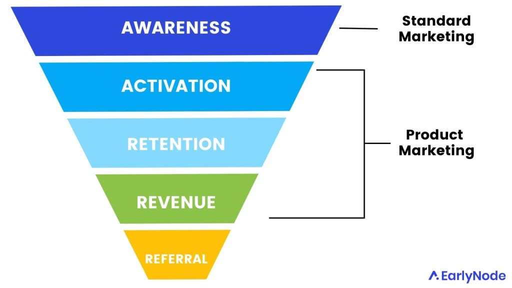 We all know about Dave McClure’s AARRR “Pirate Metrics.” General marketing is mainly focused on driving awareness with top-of-funnel strategies to drive awareness. Product marketing focuses simultaneously on the other stages as well.