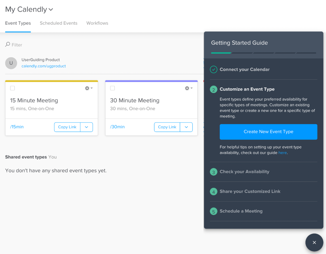 From connecting your calendar to scheduling your first event, Calendly makes it as smooth as it can get for new users. They also don’t bore their users by over-explaining everything their product can do: no extra settings, no advanced features, no complexity.
