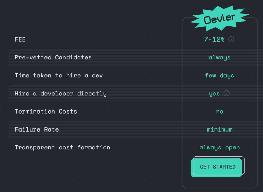 Devler charges a 7-12% commission depending on the charges of the freelancer. The higher the pay rate of the developer, the lesser the commission you’ll pay.
