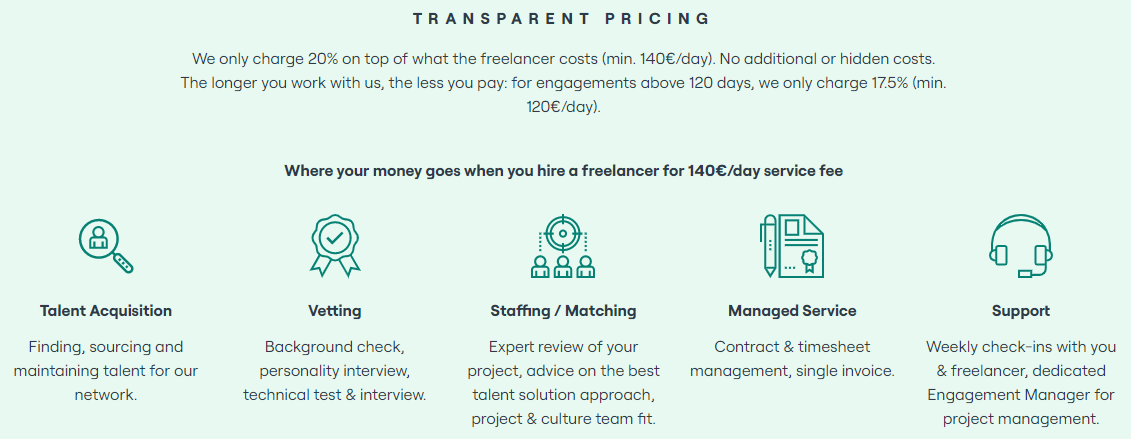 MVP Match charges clients a flat fee of 20% on top of the freelancer’s rate. The minimum is $145. Below is a screenshot of their pricing model.