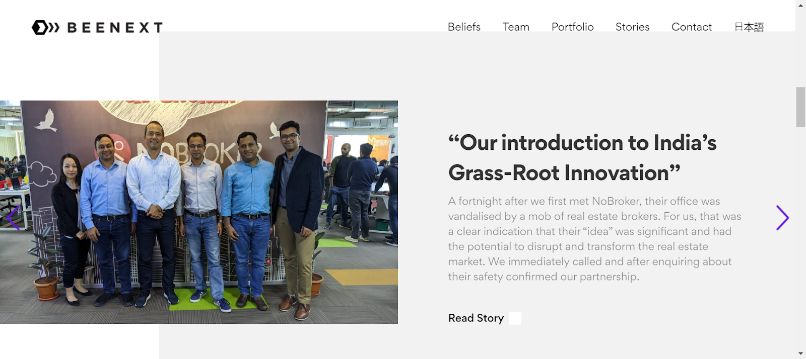 BEENEXT is a venture capital firm founded in 2015 based in Singapore. The firm primarily focuses on investments in startups from India, Southeast Asia, Japan, and the USA. BEENEXT is particularly interested in tech startups in sectors like the marketplace, Analytics, EdTech, fintech, AI, data, SaaS, IoT, healthcare, and agritech.