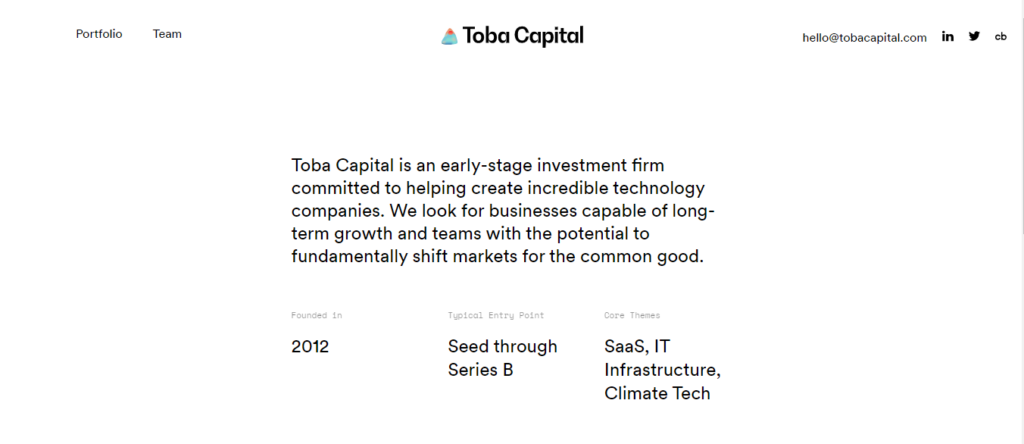 Toba Capital, founded in 2012 and based in Los Angeles & Newport Beach, CA, is an early-stage investment firm with $1.3B in assets under management. They focus on investing in businesses with the potential for long-term growth in sectors like SaaS, IT Infrastructure, and Climate Tech. Toba Capital aims to support companies that can fundamentally shift markets for the common good, entering at Seed through Series B stages and dedicating 50% of their profits to charity.